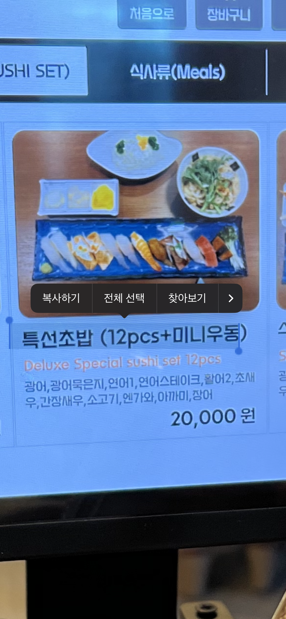 라이브 텍스트 기능을 사용하기 위해서 텍스트가 들어가 있는 사진을 사진앱에서 열어보겠습니다. 간단한 메뉴판 사진을 열어봤습니다.