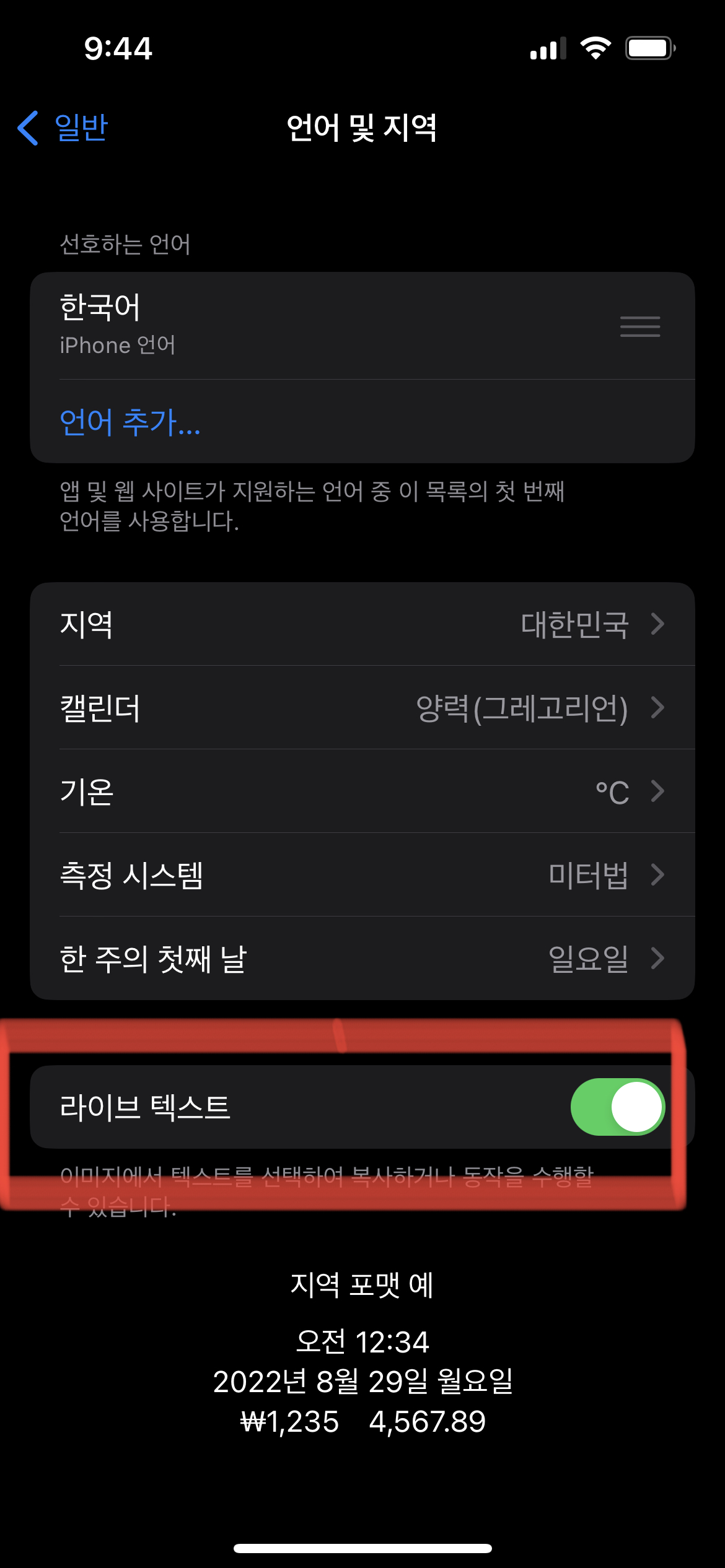 설정 앱으로 들어가서 '일반' - '언어 및 지역' 메뉴로 들어가면 '라이브 텍스트'를 켜고 끌 수 있는 메뉴가 있습니다. 이 메뉴를 통해 라이브 텍스트를 사용하거나 사용하지 않도록 설정할 수 있습니다.
