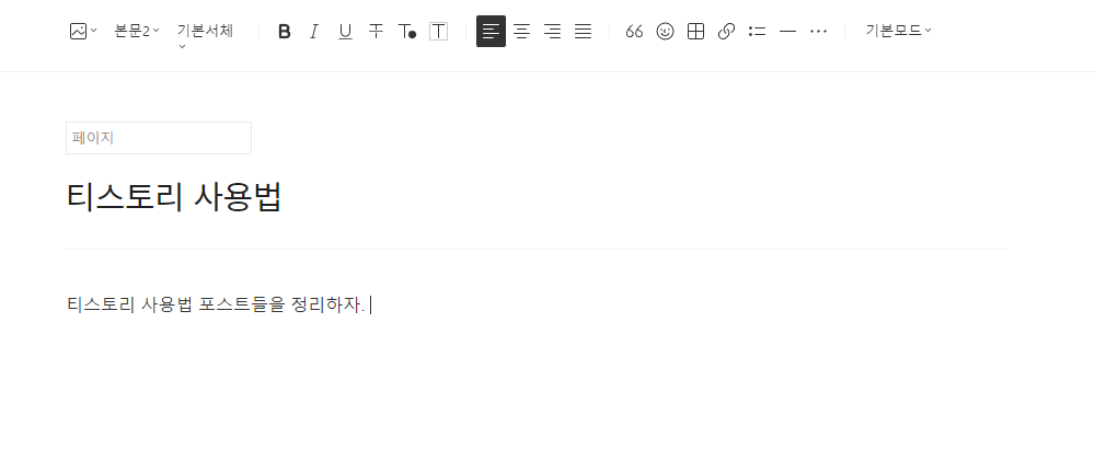 '페이지 쓰기' 버튼을 누르면 일반 블로그 포스트를 작성하는 에디터 창과 비슷한 에디터가 나옵니다. 이곳에 페이지 컨텐츠를 작성해주면 됩니다.
