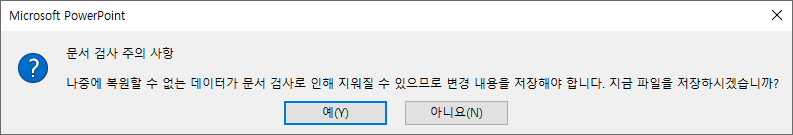 문서 검사를 통해 슬라이드 전체에 걸쳐 복원할 수 없는 데이터가 지워질 수 있으므로 파일을 저장해둡니다.