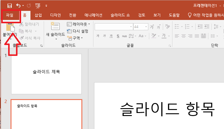 파워포인트의 메뉴 중 [파일]을 클릭합니다.