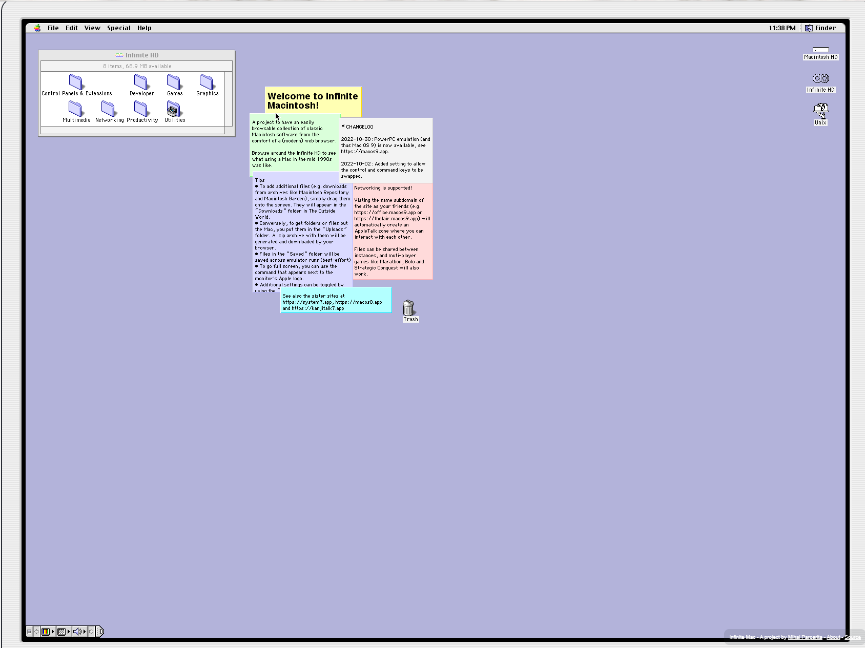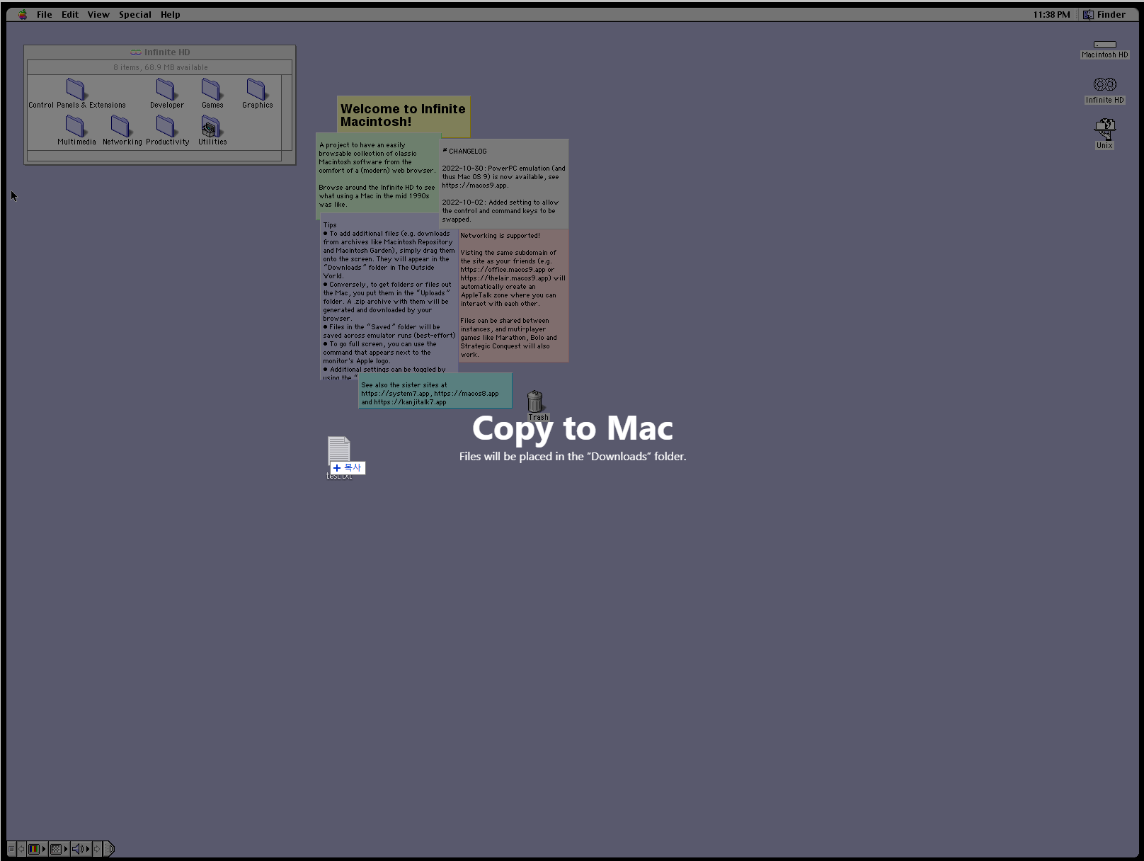 웹 페이지에 노트북 같은 화면이 구동되면서 Mac OS 옛날 버전 GUI가 뜹니다. 저는 이 시절에 맥을 사용해보지는 못 해서 인터페이스에 익숙하지는 않습니다만 그 당시에 사용해보셨던 분들에겐 향수가 아닐까 싶습니다.