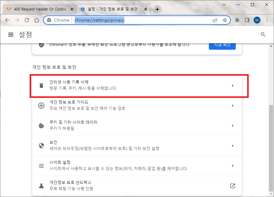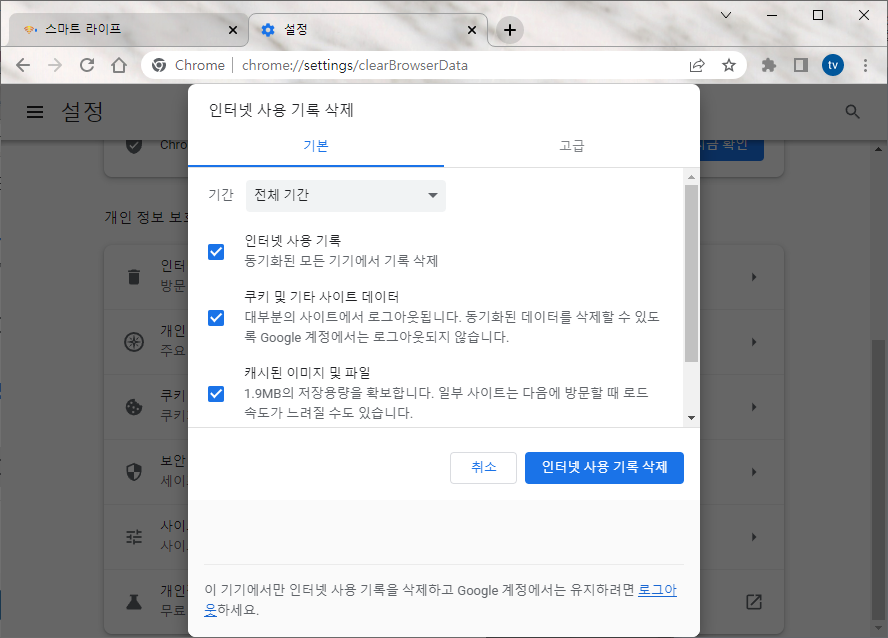 [설정] - [개인정보 및 보안] - [인터넷 사용 기록 삭제] 탭을 찾아 들어간다. 혹은 chrome://settings/clearBrowserData 페이지에 접속한다.