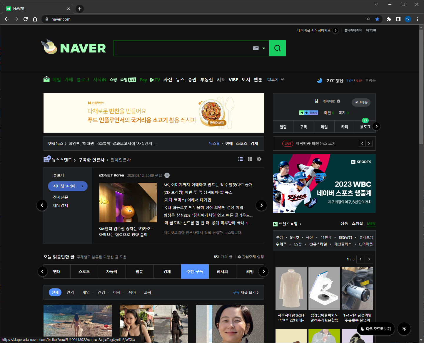크롬의 영역은 모두 다크모드가 적용되었습니다. 하지만 웹 페이지들은 여전히 흰색 배경으로 나오는 경우가 많습니다. 대표적으로 네이버의 홈 화면을 띄워보면