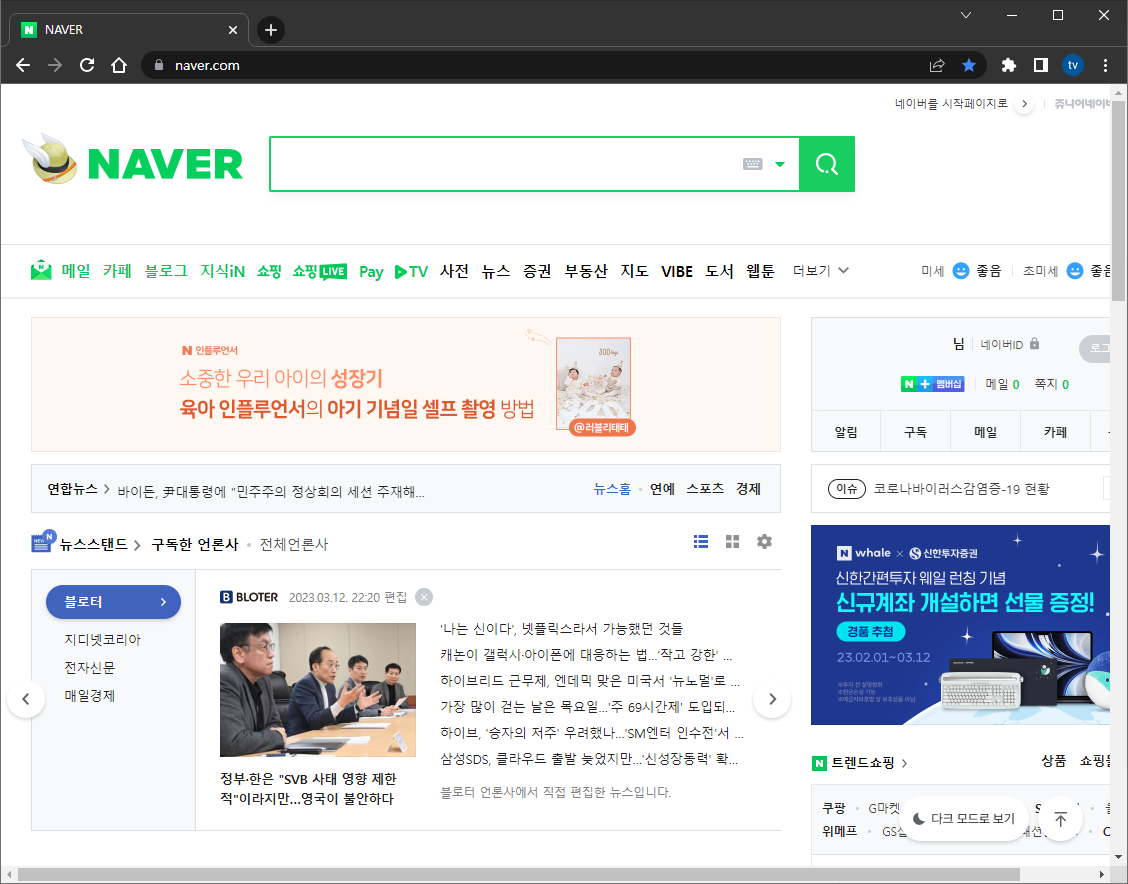 크롬의 영역은 모두 다크모드가 적용되었습니다. 하지만 웹 페이지들은 여전히 흰색 배경으로 나오는 경우가 많습니다. 대표적으로 네이버의 홈 화면을 띄워보면