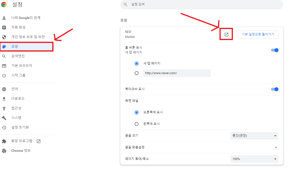 크롬의 설정을 변경할 수 있는 화면이 나옵니다. 왼쪽 색션에 있는 메뉴 중에 '모양' 메뉴를 선택합니다. 오른쪽 섹션에 나오는 내용 중에 '테마' 항목 쪽에 있는 바로가기 아이콘을 누르면 크롬 웹 스토어로 이동할 수 있습니다.