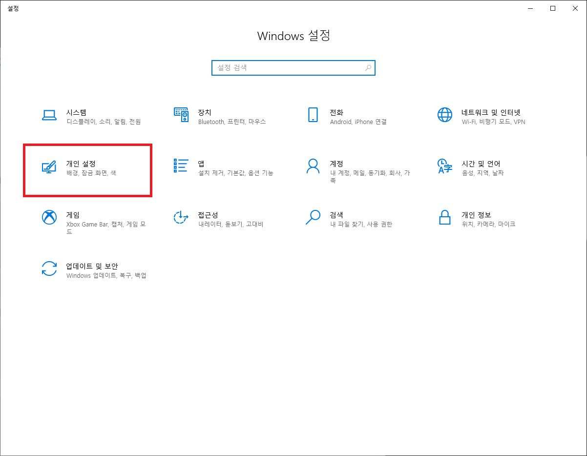 우선 'Windows 설정'을 띄워서 '개인설정' 항목을 선택합니다.