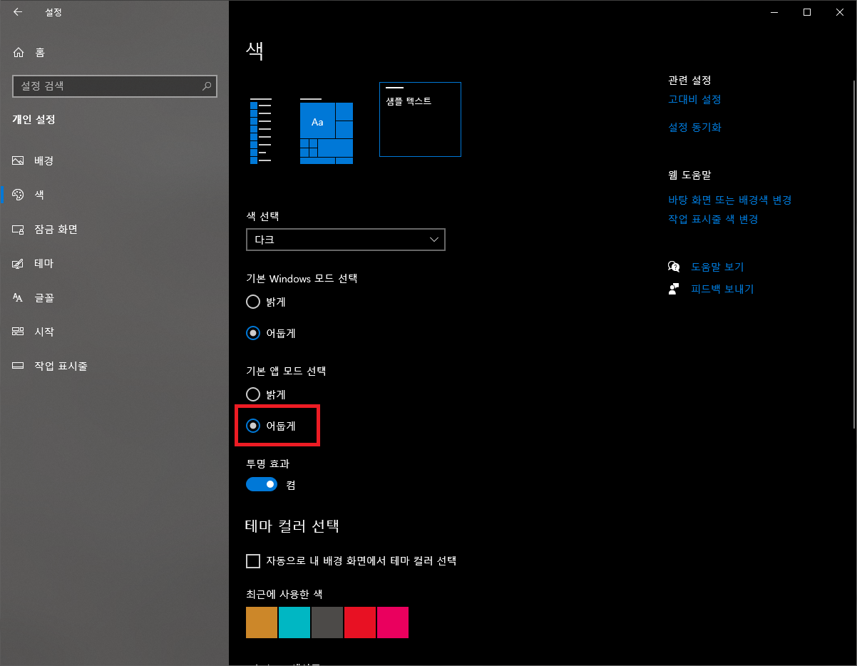 왼쪽에 표시되는 메뉴들 중 '색' 메뉴를 선택합니다. 윈도우의 앱들에 적용될 색상 관련 설정들이 나오는데요. 오른쪽 섹션에서 '기본 앱 모드 선택' 항목을 어둡게로 변경합니다. 그러면 윈도우 설정 앱의 배경도 흰색에서 검은색으로 변경됩니다.