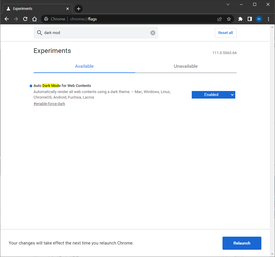 그리고 검색창에 dark mode를 입력합니다. 그러면 크롬에 적용할 수 있는 Experiments 기능 중에 Auto Dark Mode for Web Contents가 나옵니다. 이 항목의 설정 값은 Default 인데요. 이걸 Enabled로 바꿔줍니다. 그리고 Relaunch 버튼을 눌러서 웹 브라우저 전체를 재시작 해줍니다.