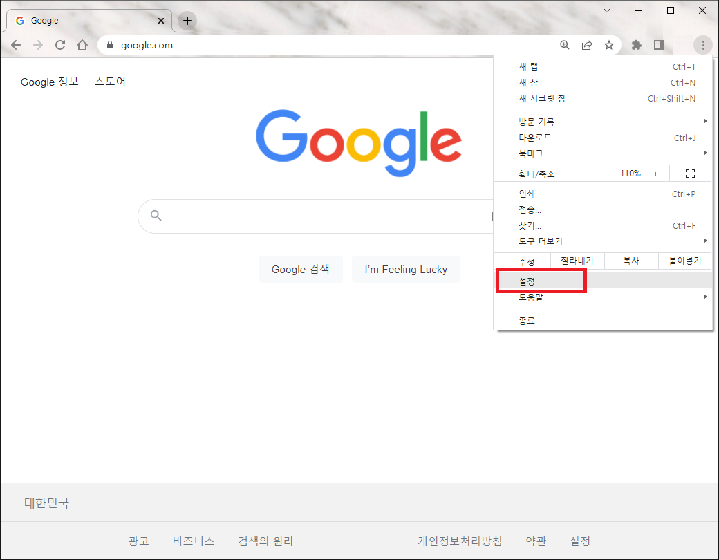 크롬의 주소창 오른쪽에 있는 점 세개 버튼을 눌러 나오는 메뉴 중에 '설정' 메뉴를 클릭합니다.