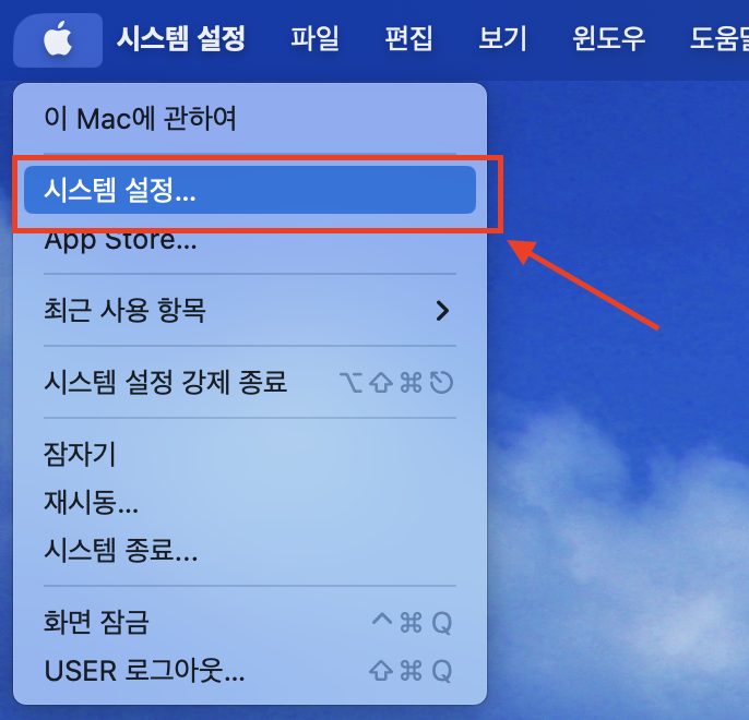 우선 설정 앱을 열어야 한다. 설정 앱은 화면 하단에 있는 독(Dock)에서 설정 아이콘을 클릭해 실행하거나 화면 상단에 있는 애플 마크를 클릭해서 '시스템 설정' 항목을 클릭해서 실행할 수 있다.