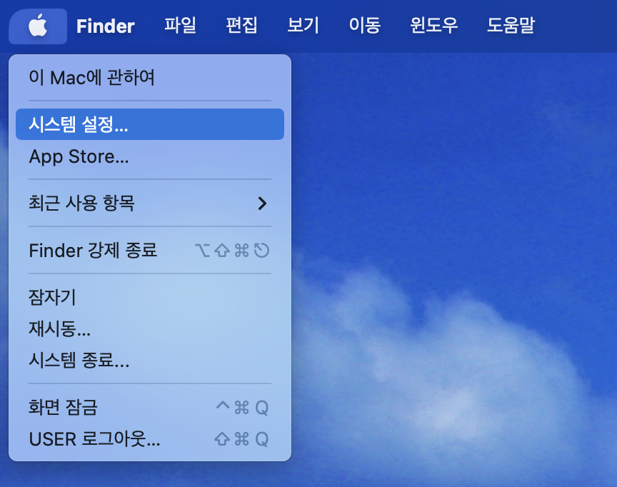 맥북의 화면 하단에 있는 톱니 바퀴 모양의 시스템 설정 앱 아이콘을 클릭하거나 상단의 애플 마크를 클릭하면 나오는 메뉴에서 '시스템 설정'을 선택한다.