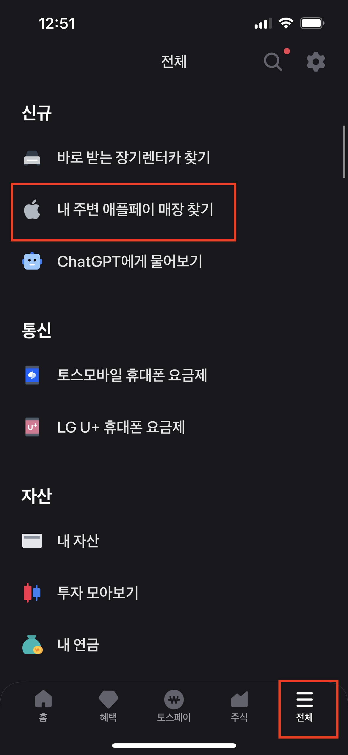 토스앱에서 '내 주변 애플페이 매장 찾기' 기능은 앱 화면 하단의 '전체' 버튼을 눌러서 찾아 들어갈 수 있습니다. 서비스를 이용하기 위해 현재 내 위치를 토스에 제공한다는 내용의 동의만 하면 됩니다.