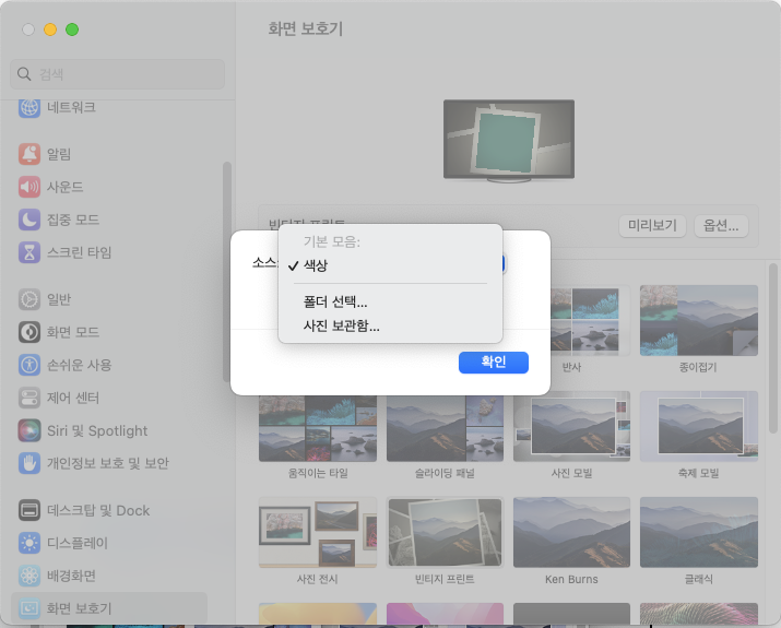 예를 들어 빈티지 프린트를 선택하면 '옵션' 버튼이 활성화되는데, 옵션 버튼을 누르면 빈티지 프린트 화면보호기에 뭘 사용할지 선택할 수 있다. 여기에 폴더나 사진 보관함을 선택하면 폴더에 있는 사진이나 사진 보관함에 있는 사진들을 사용해 화면보호기를 만들 수 있다.