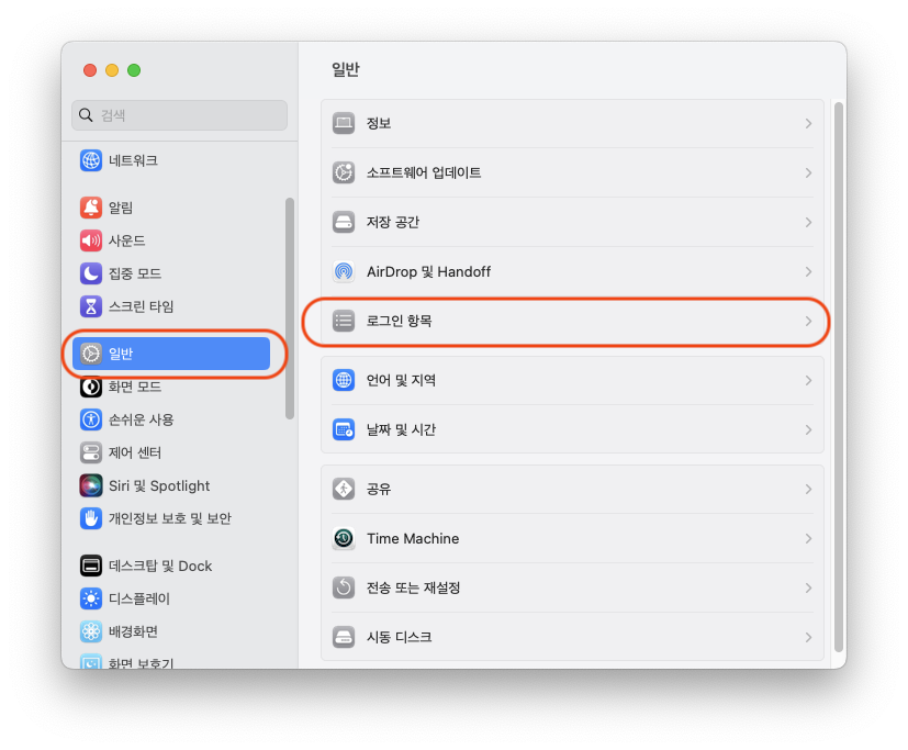 '일반' 메뉴를 선택하고 '로그인 항목'을 선택해준다.