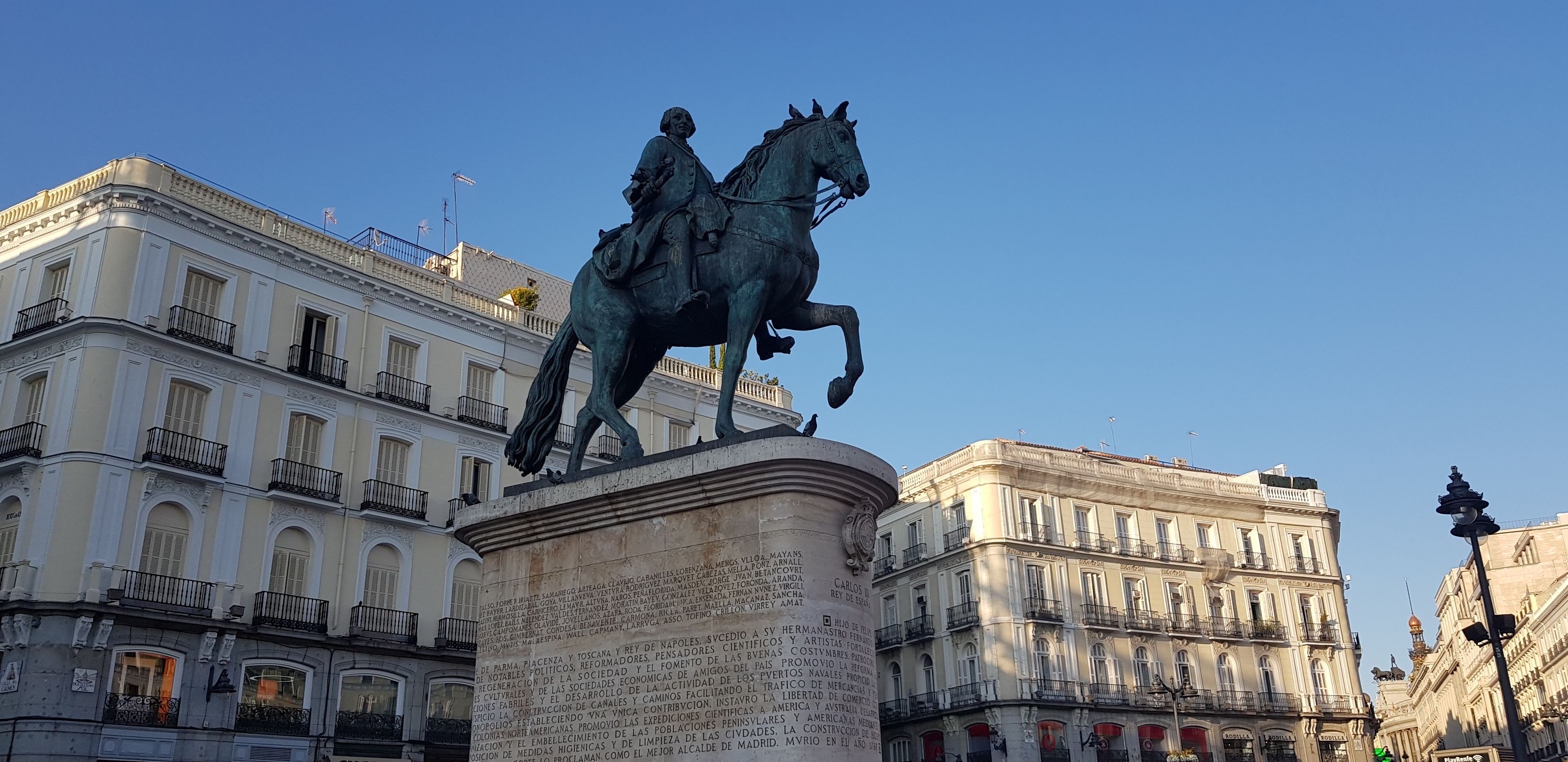 솔 광장에 들어서면 보이는 말을 탄 사람의 동상은 '카를로스 3세'의 동상입니다. 마드리드의 유명한 미술관인 '프라도 미술관'이 바로 카를로스 3세가 통치할 때 건립되었습니다.