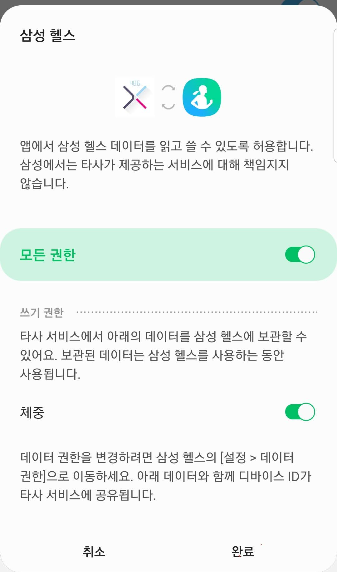 '모든권한'을 활성화해서 피쿡에서 삼성헬스로 넘겨줄 수 있는 데이터를 넘겨줍니다.