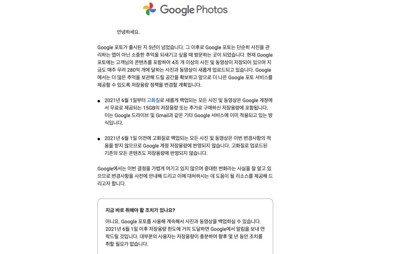 구글은 무제한 무료 저장 플랜을 2021년 6월 1일부터 제공하지 않겠다고 발표했습니다. 이 후부터 사용자는 계정당 제공되는 15GB 내에서만 사진과 동영상 그리고 지메일과 구글 드라이브를 사용할 수 있게 됩니다.