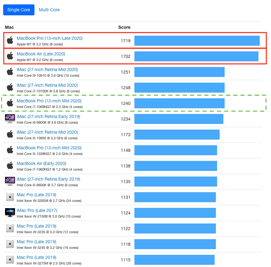 차트에서 새로운 맥미니는 안보이긴 합니다. 애플 실리콘 M1 칩이 탑재된 '맥북 에어'와 '맥북 프로13' 제품 모두 싱글코어에서 1700점이 넘는 벤치마크 점수를 기록했습니다.