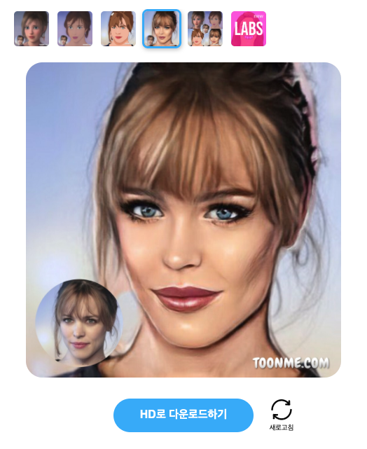 어바웃타임의 여자주인공인 '레이첼 맥 아담스'의 사진을 넣어봤습니다. 서양사람이 좀 더 잘 처리되는 것 같기도 합니다. Toonme LABS로 들어가면 실험적인 스타일도 확인해볼 수 있습니다.