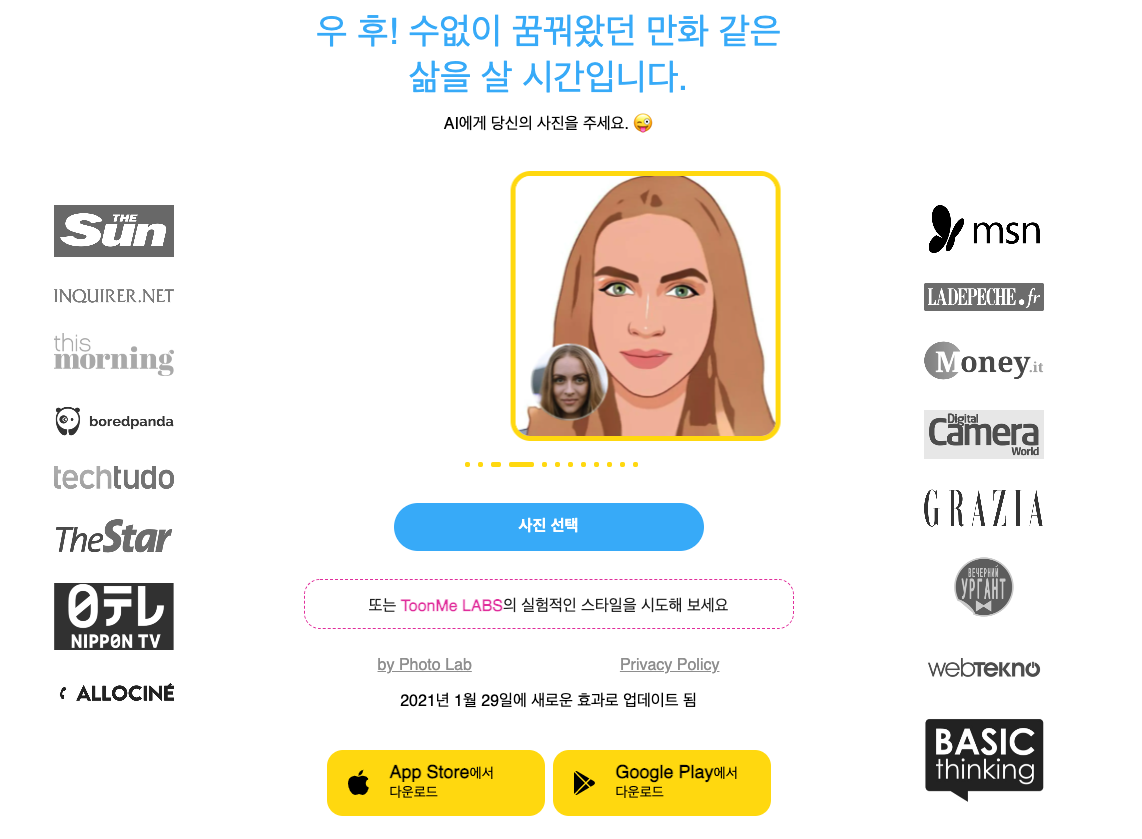 적당한 사진을 업로드해서 인스타나 카톡 프로필용 애니메이션 이미지를 뽑는 재미도 있을 것 같네요. 애플 앱스토어와 구글 플레이에 Toonme 앱으로 만들어져 있으니 스마트폰으로 셀카를 찍어서 바로바로 확인할 수도 있습니다.