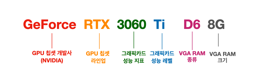 그래픽카드 이름의 맨 마지막에 붙은 태그는 그래픽카드 메모리와 관련되어 있습니다. D5 / D5X / D6 / D6X 는 그래픽카드의 메모리 규격을 의미합니다.