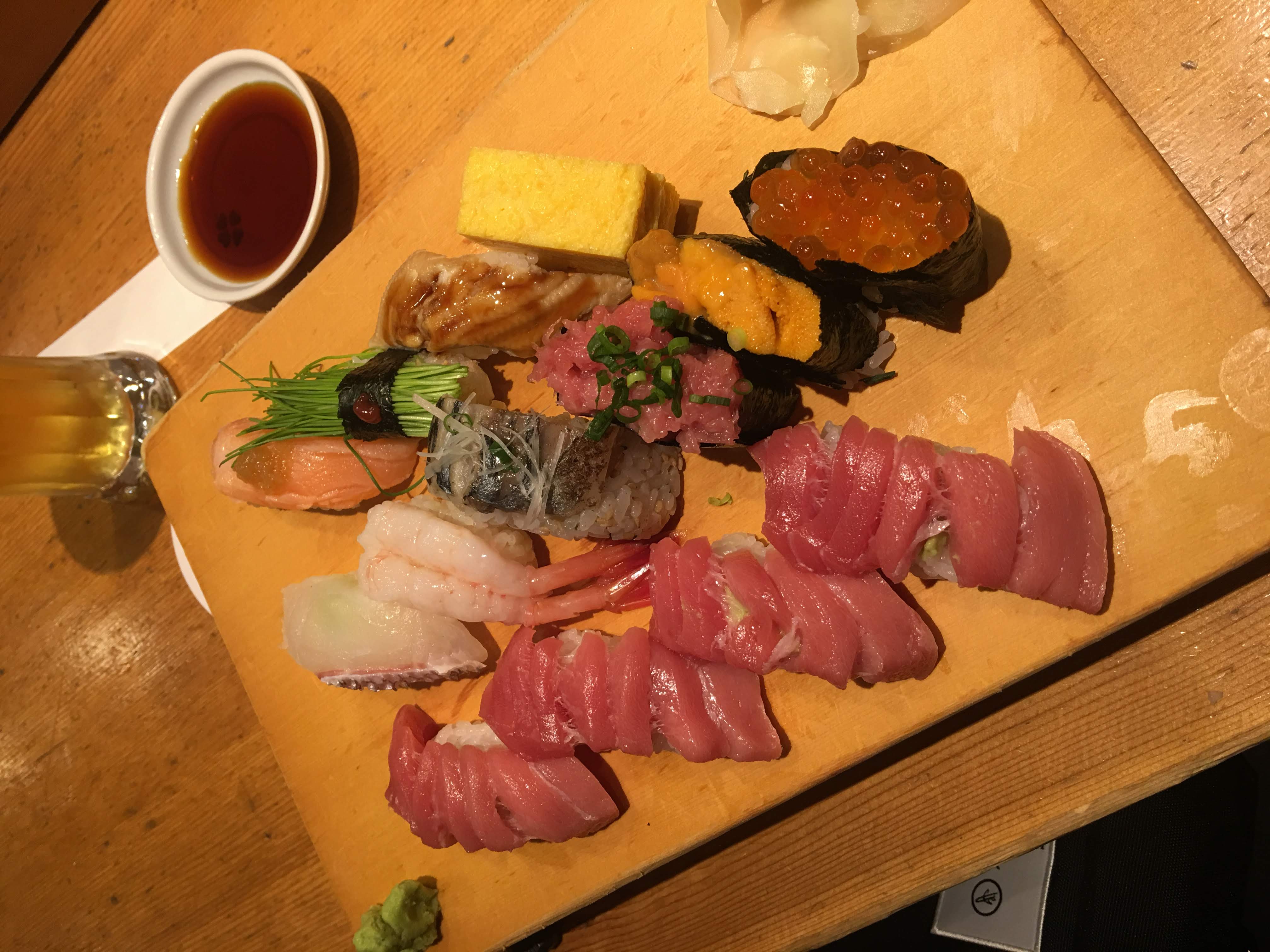 드디어 도쿄에서의 첫 번째 저녁식사. 먹음직스러운 스시들이 윤기를 자랑하며 빛나고 있습니다.