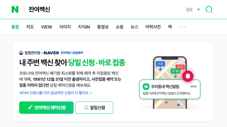 PC를 이용하시는 분들은 네이버 검색창에 '잔여백신'이라고 검색하시면 됩니다. (관련링크 : 네이버 검색 '잔여백신')