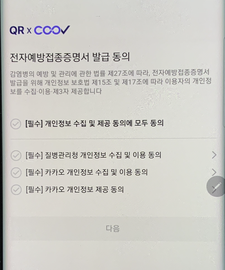 백신 접종 증명을 해주는 COOV 앱과의 연결이 필요한데요. 여러가지 개인정보 수집 동의가 필요합니다. (필수)라고 되어 있는 항목들을 선택해서 '다음'으로 넘어갑니다.
