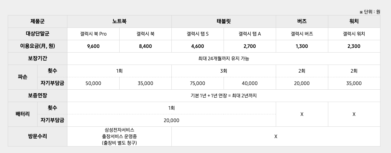 갤럭시 버즈와 워치 제품에 대한 월정액 요금은 동일합니다. 노트북과 태블릿 제품에 대한 월정액 금액은 약간 인하되었습니다.