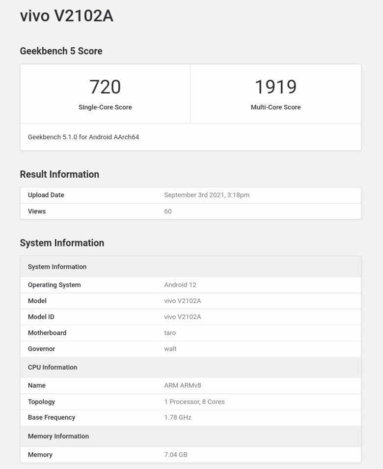 이런 가운데 '스냅드래곤 895(898)'을 탑재한 VIVO의 V2102A 스마트폰이 긱벤치에 등록되었습니다. (링크 : 긱벤치 V2102A 정보)