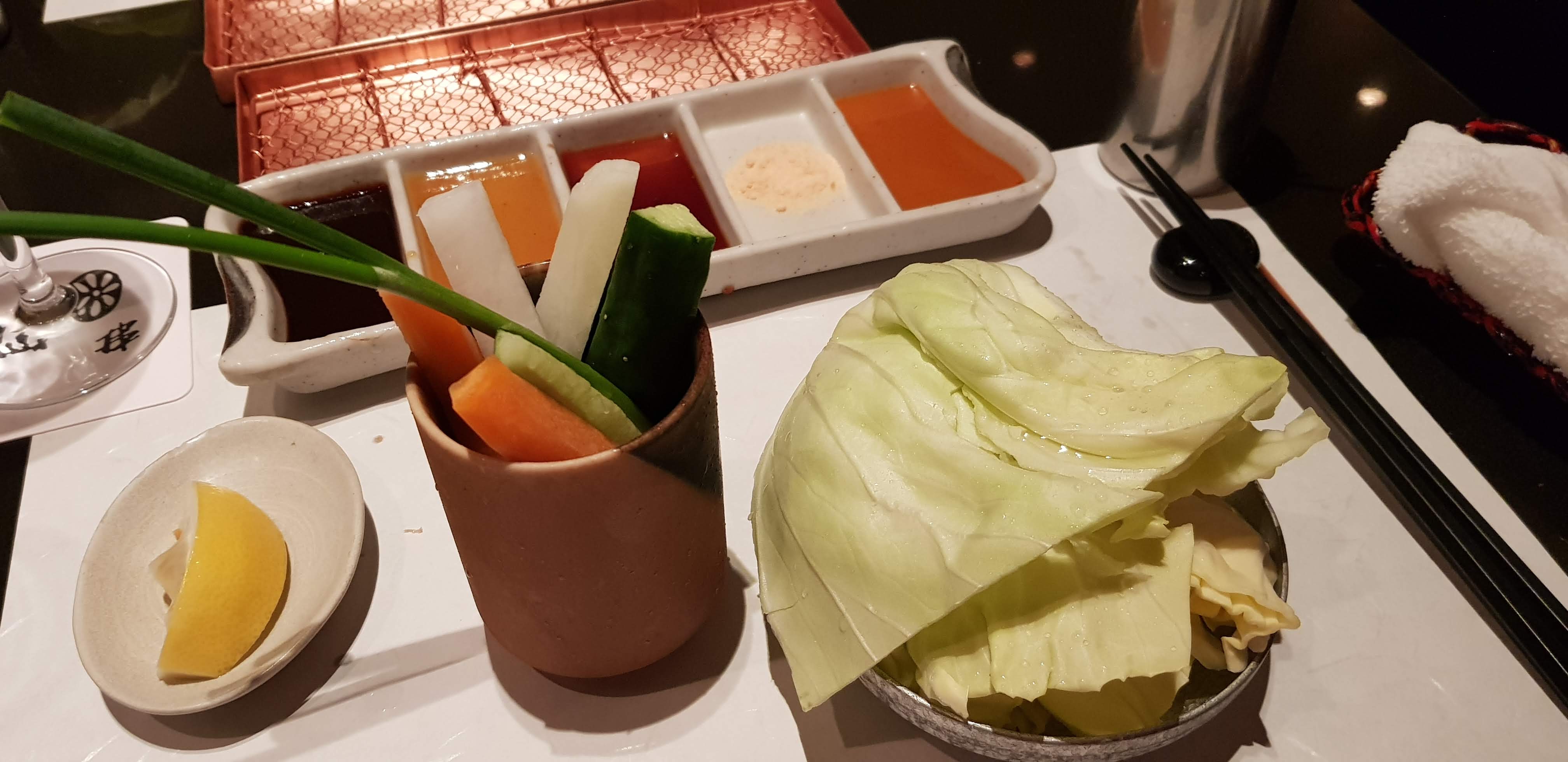 두 번째는 게 다리 튀김. 5개의 소스가 세팅되어 있고 찍어먹으면 좋은 소스 앞에 튀김을 놔줍니다. 게 다리 튀김은 두 번째 소스를 찍어 먹으면 좋다고 해서 그렇게 하고 있습니다. (그런데 소금이 제일 맛있는것 같던데..)