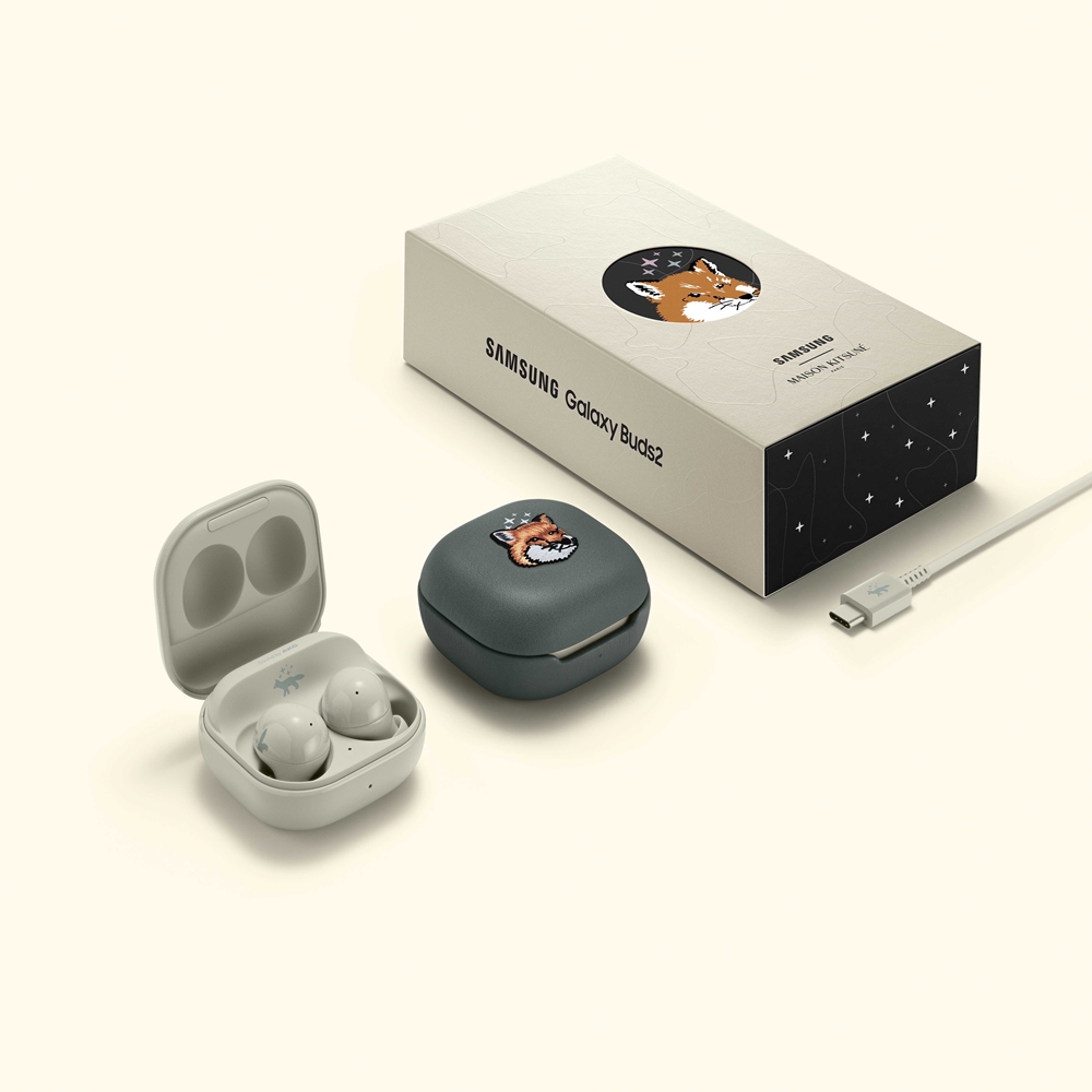 '갤럭시 버즈2' 메종 키츠네 에디션은 문락 베이지 색상을 바탕으로 여우 모양과 별 모양이 이어버드에 새겨져있습니다. 또 한 스타더스트 그레이 색상의 가죽 충전 케이스에는 메종키츠네 폭스 헤드 로고가 새겨져있습니다. 여우 모양을 통해서 브랜드의 아이덴티티를 강조했습니다.