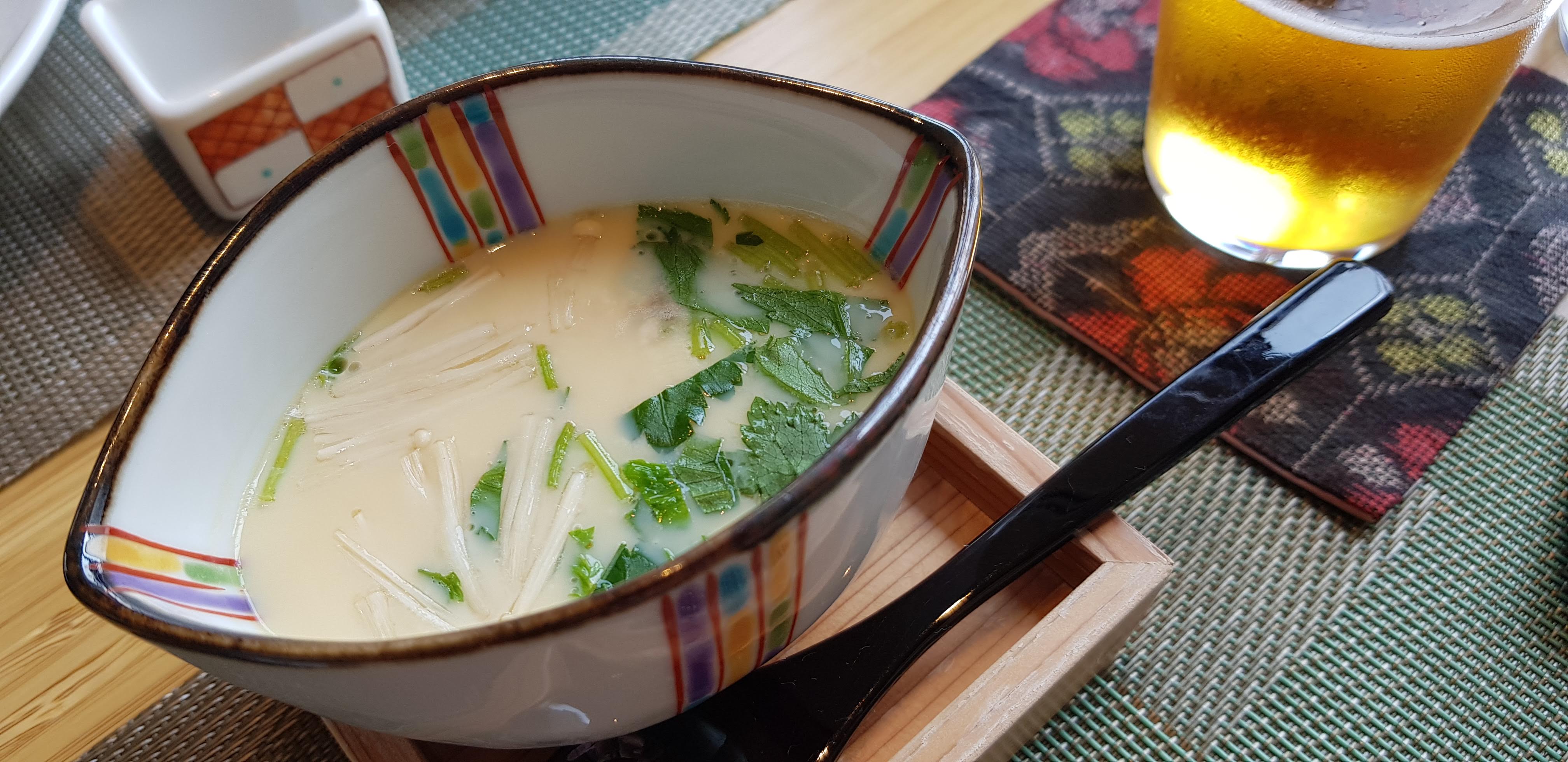 다음 요리는 일본식 계란찜이었나 그럴겁니다. 저기 들어가있는 풀잎의 향이 참 특이했는데요. 일본 깻잎? 시소? 그런거였던거 같습니다. 나중에 찾아보니 이름이 자완무시(Chawanmushi)라고 일본식 계란찜이라고 합니다.