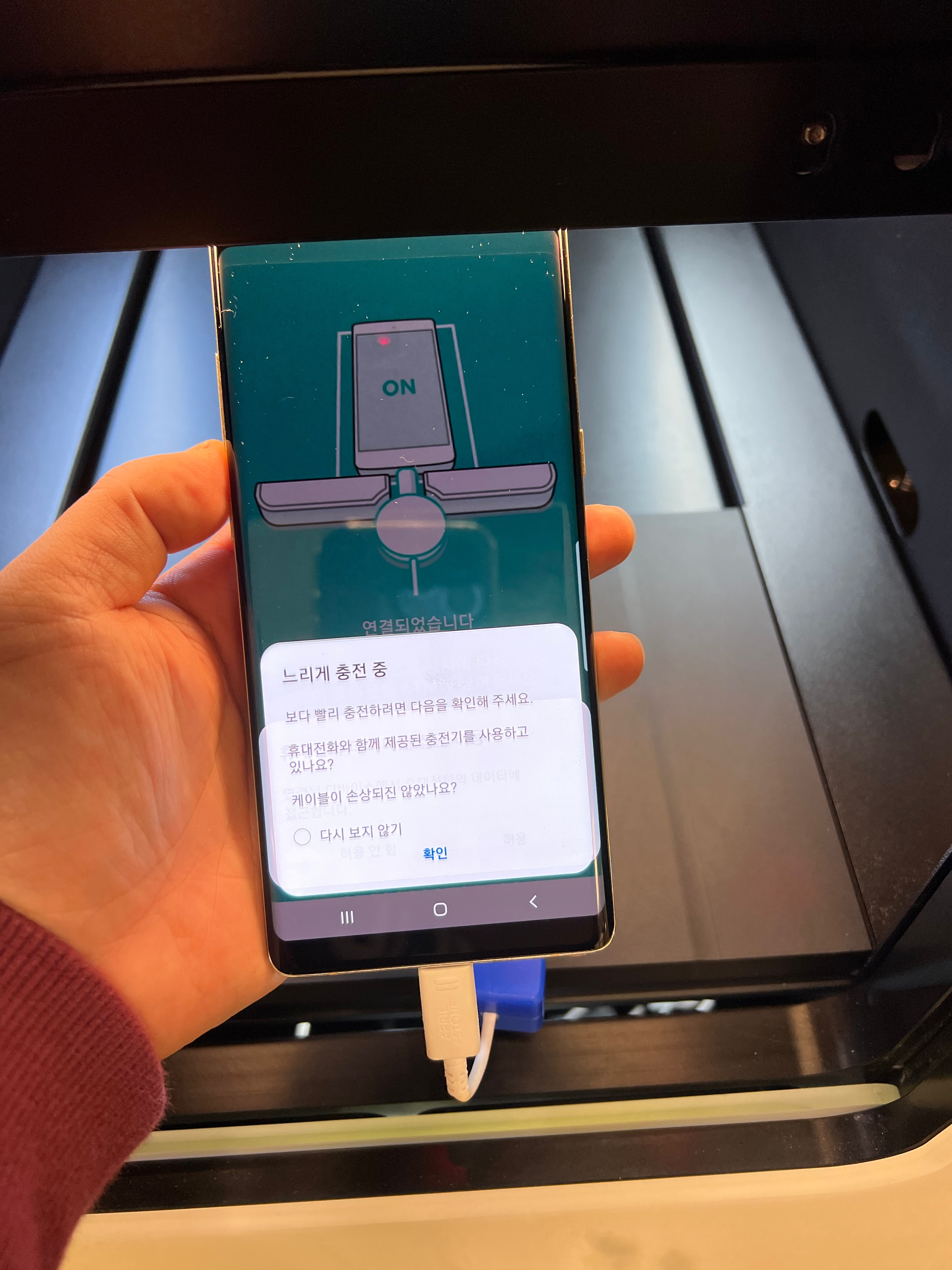 쭉 진행을 하면 덜컹하고 민팃 ATM 기기의 문이 열립니다. 이 곳에 있는 케이블을 스마트폰과 연결한 다음 앱이 시키는대로 잘 놓아 줍니다.