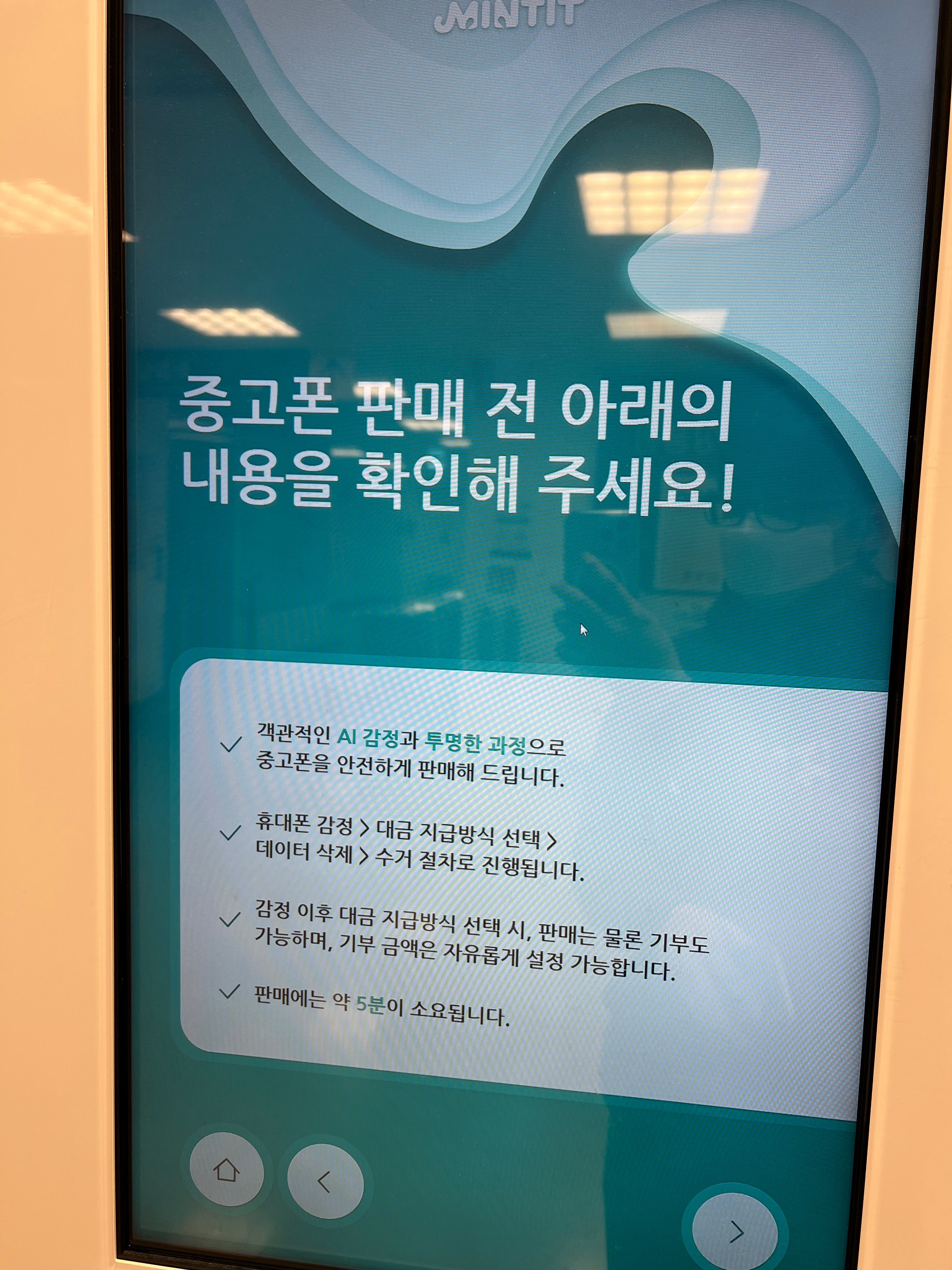 중고폰 판매를 위한 유의사항을 읽어보고 다음으로 넘어갑니다. 여기서부터 민티 ATM 기기가 화면으로 시키는 대로 따라하면 됩니다.