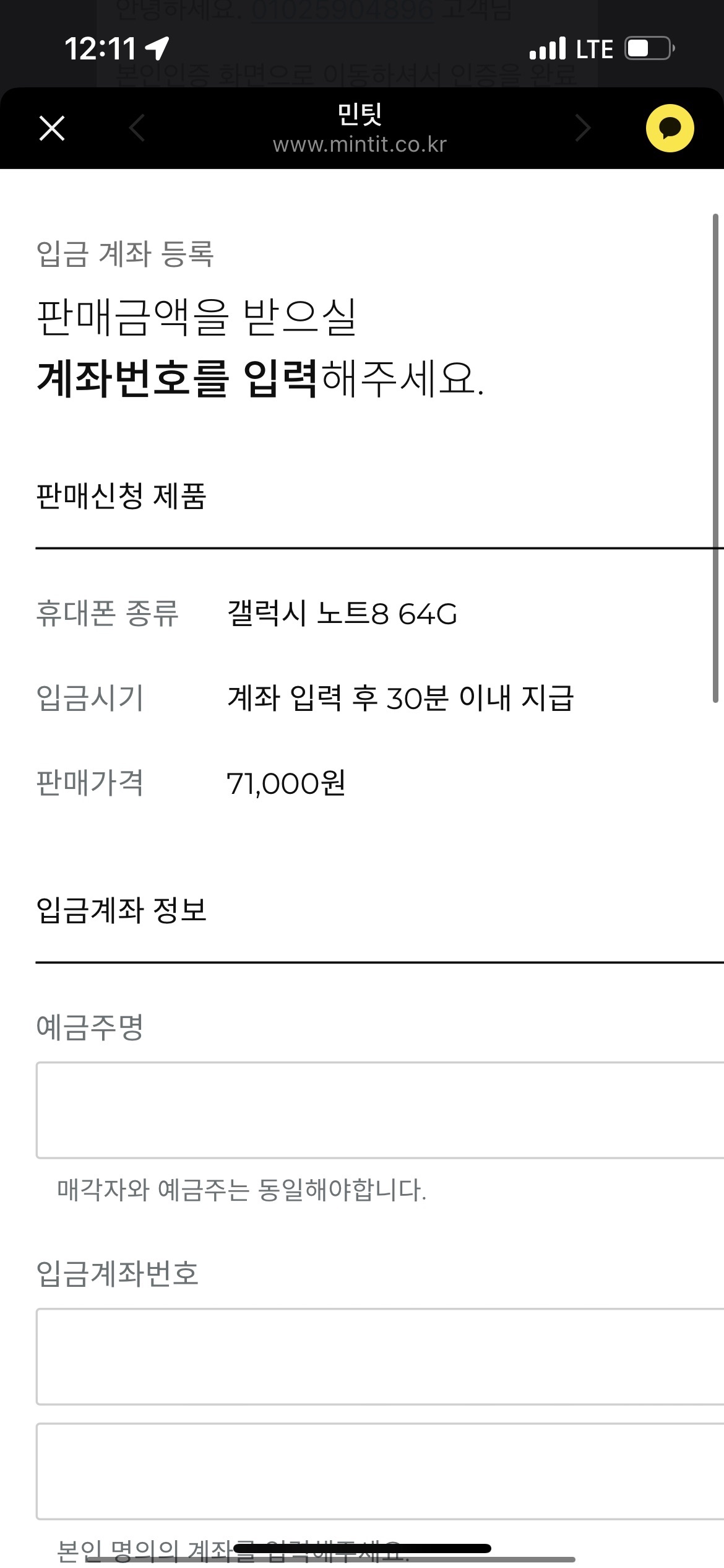 이제 새 스마트폰에서 민팃으로부터 받은 접수증을 통해 입금 받을 계좌번호를 입력하면 됩니다. 편리하게 잘 되어 있습니다.