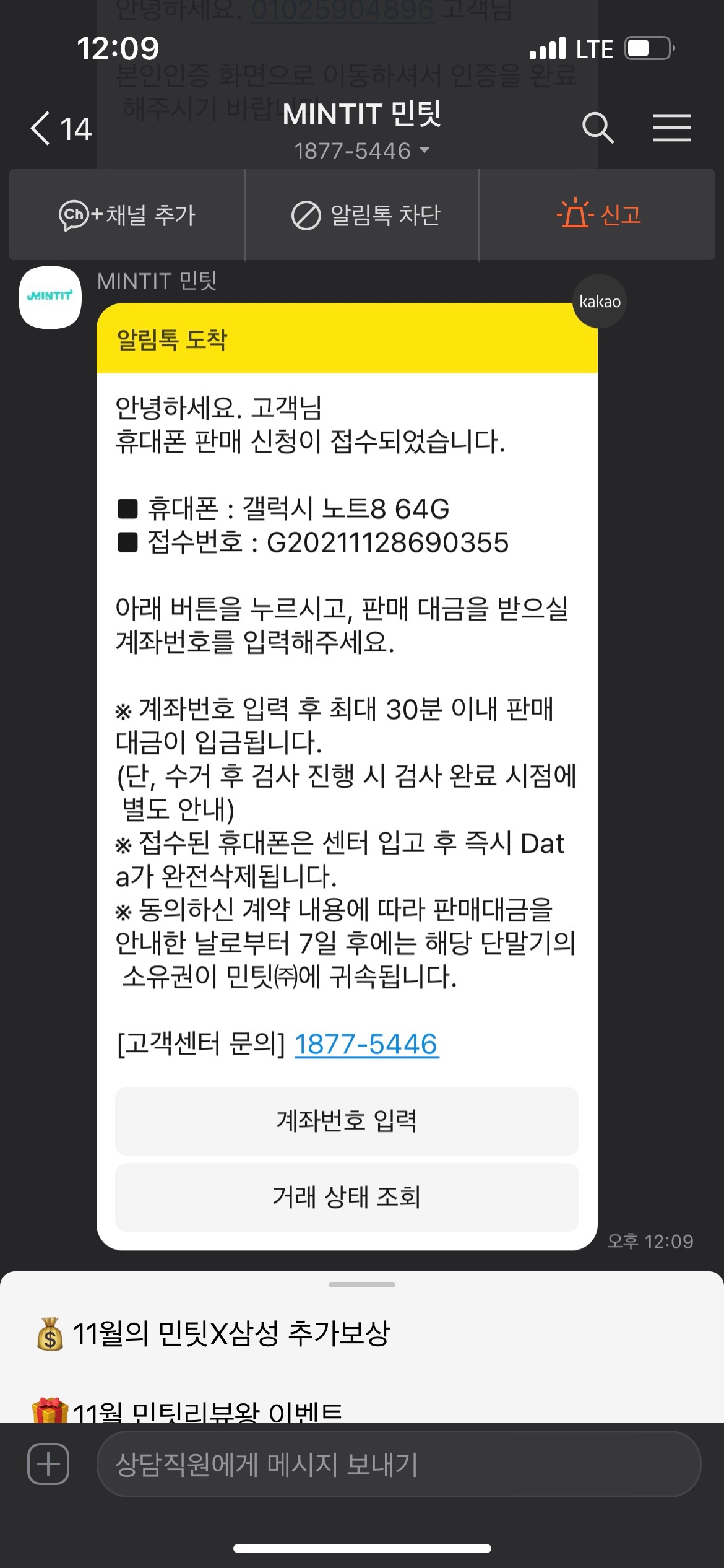 '계좌로 입금'을 선택하면 아까 본인 인증을 했던 카카오 톡으로 접수증이 옵니다. 그리고 민팃 ATM 기기는 판매할 스마트폰을 수납하고 종료합니다.
