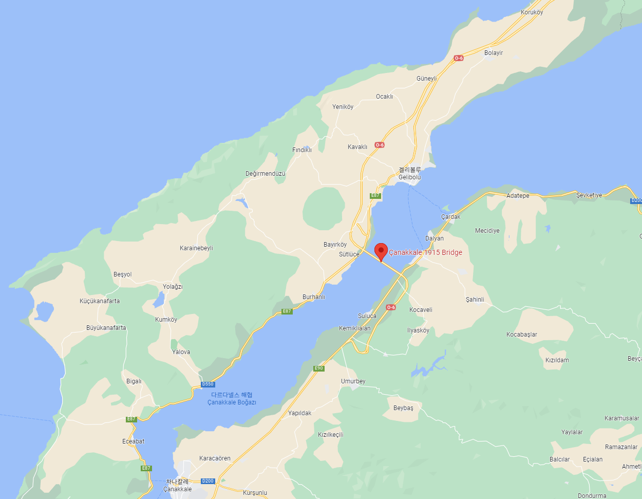 차나칼레 대교는 바로 이곳에 위치하고 있습니다. (링크 : 구글 지도 '차나칼레 대교')