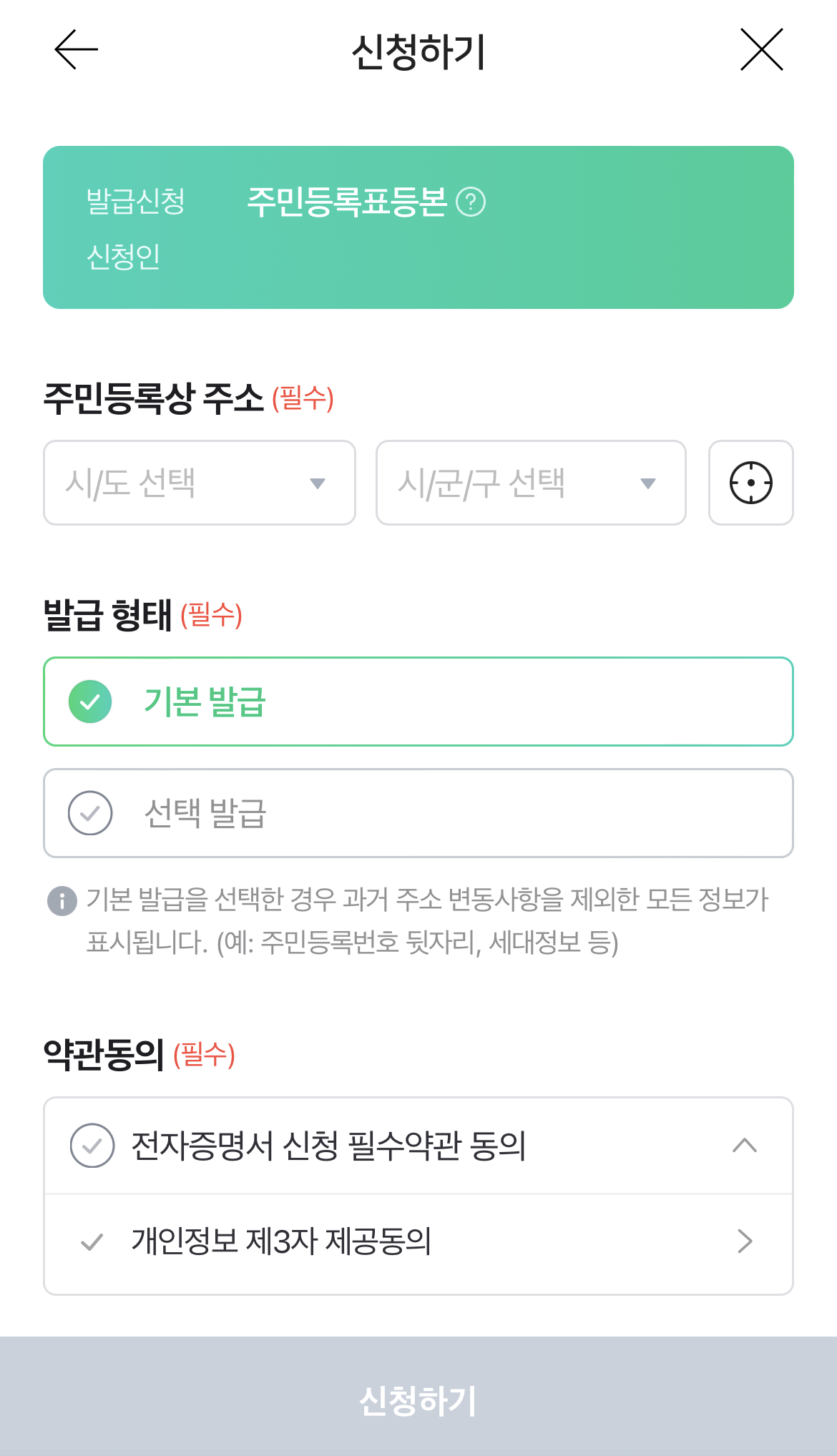 정부24에서 입력했던 것처럼 주민등록상 주소 정보를 입력하고, 약관동의를 누른 다음 신청하기를 눌러 진행합니다.
