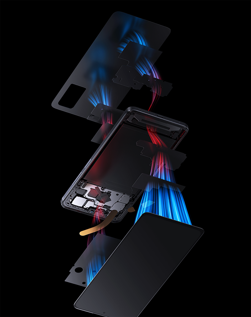 리퀴드쿨(LiquidCool) 기술을 통해 기기에서 발생하는 열을 효과적으로 방출하도록 설계되었습니다. 고리 모양의 히트 파이프 시스템과 여러 층의 흑연 시트가 포함되어 있어 열을 냉각하여 빠르게 충전할 수 있도록 지원하며, 증발기, 응축기, 리필 챔버, 가스, 액체 파이프로 구성되어 있습니다.
