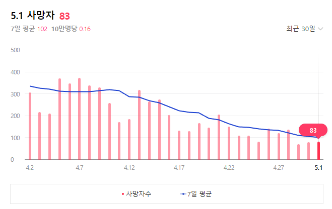 최근 하루 확진자 수가 3월 3주차에 정점을 찍고 꾸준하게 감소하고 있는 상황이며 위중증 환자와 사망자 수도 완만한 감소 양상이 지속되고 있습니다. 이에 정부는 사회적 거리두기 해제(4월 18일)와 코로나19 감염병 등급을 1등급에서 2등급으로 조정(4월 25일)했습니다. 이어서 실외에서는 마스크를 착용하지 않아도 과태료를 부과하지 않도록 착용의무를 해제(5월 2일)했습니다.