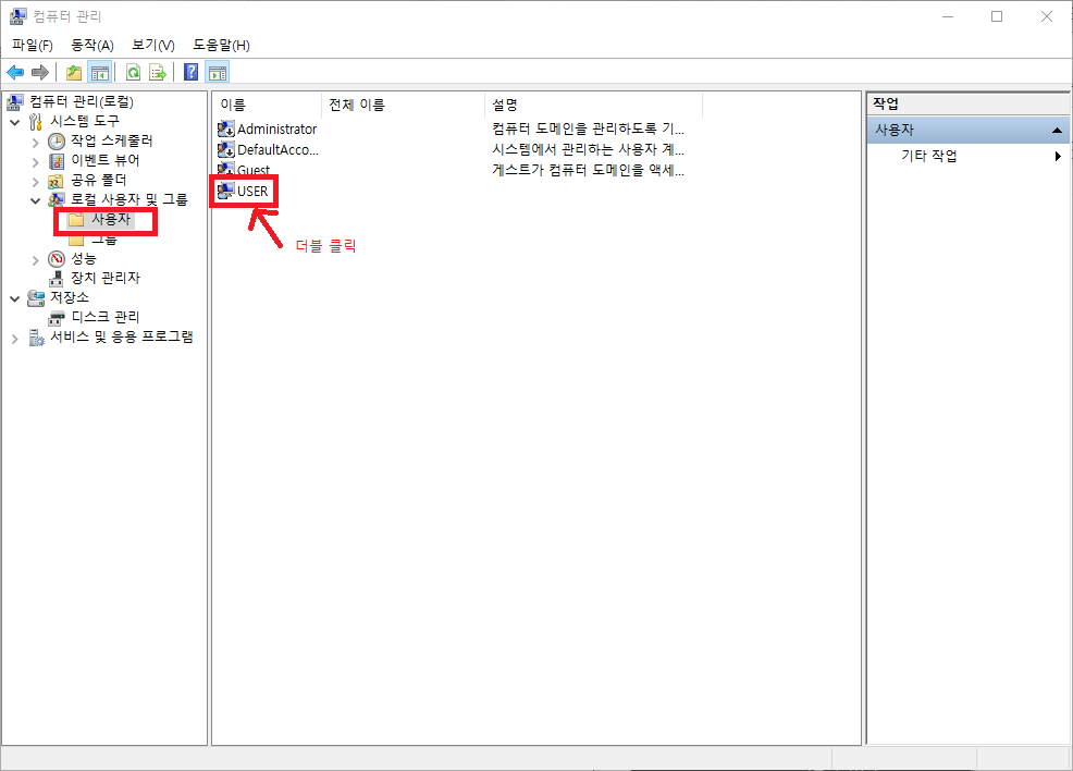 컴퓨터 관리 창에서 왼쪽 메뉴 중 '시스템 도구' - '로컬 사용자 및 그룹' - '사용자' 순으로 들어갑니다. 그러면 시스템에 있는 사용자들이 나오는데요. 정책을 변경할 사용자를 더블 클릭합니다.