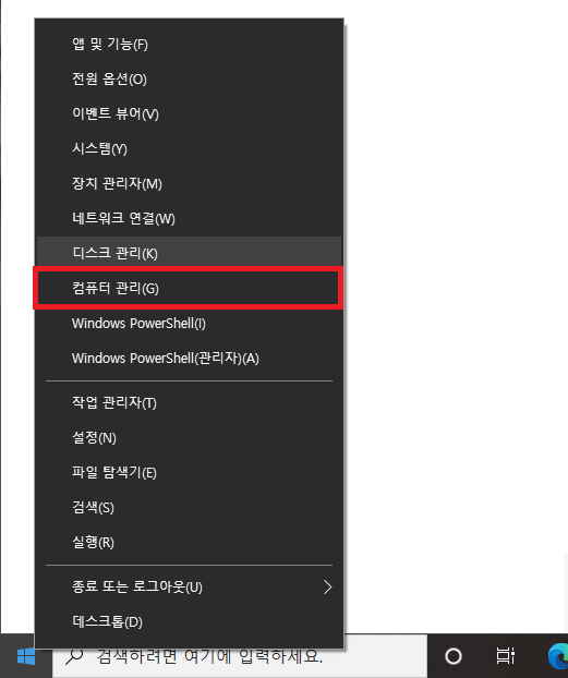 그러면 몇 가지 메뉴들이 나오는데요. '컴퓨터 관리(G)' 항목을 선택합니다.