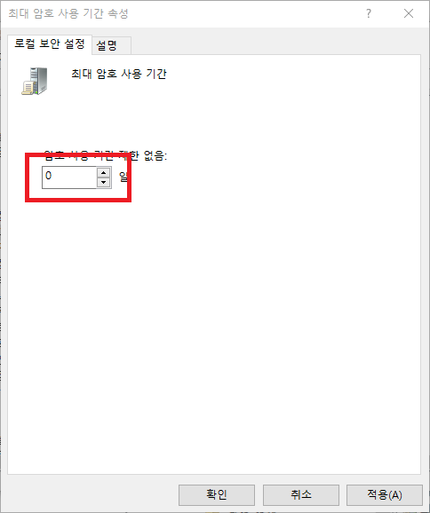 최대 암호 사용 기간을 '0'으로 설정한 다음 확인을 눌러 완료합니다.