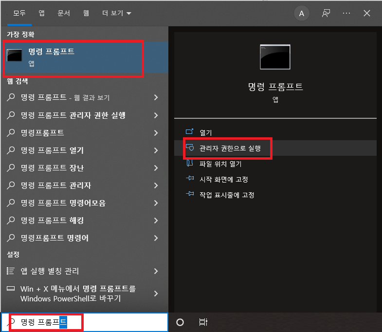 윈도우의 검색 화면 혹은 '윈도우키' + 'Q'를 눌러서 "명령 프롬프트"를 입력합니다. 그러면 명령 프롬프트 앱이 나오는데요. 관리자 권한으로 실행해줍니다.