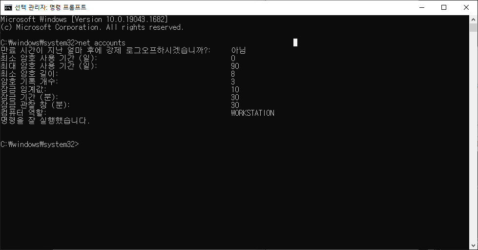 이 명령을 이용해 현재 설정을 확인하고 암호 만료 기간을 지정하려면 'net accounts /maxpwage:사용일수' 명령을 입력하면 됩니다.