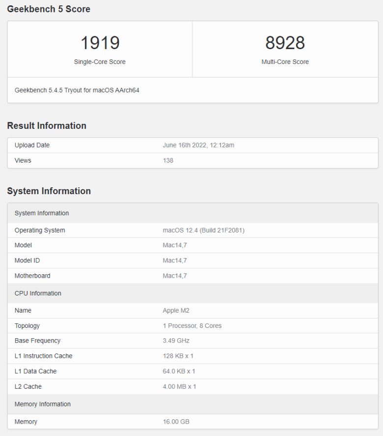 애플 M2 칩 성능 정보 및 긱벤치 스코어