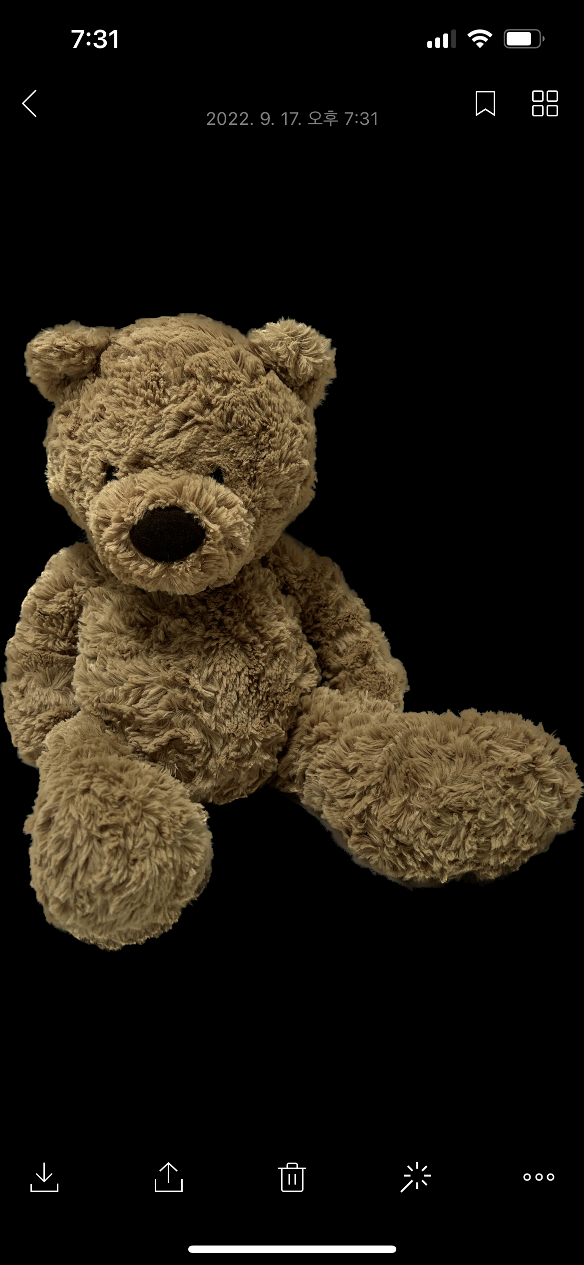 곰인형 사진에서 누끼 따기를 할 곰인형을 손가락으로 살짝 누르고 있으면 됩니다. 그러면 사진 앱에서 곰인형의 윤곽을 따라 마치 마법이 적용된 것처럼 반짝이는 효과가 나타납니다. 그러면서 누끼가 따지고 사진 앱에서 누끼가 따진 곰인형 부분이 살짝 들어올려진 것 같은 느낌이 납니다.