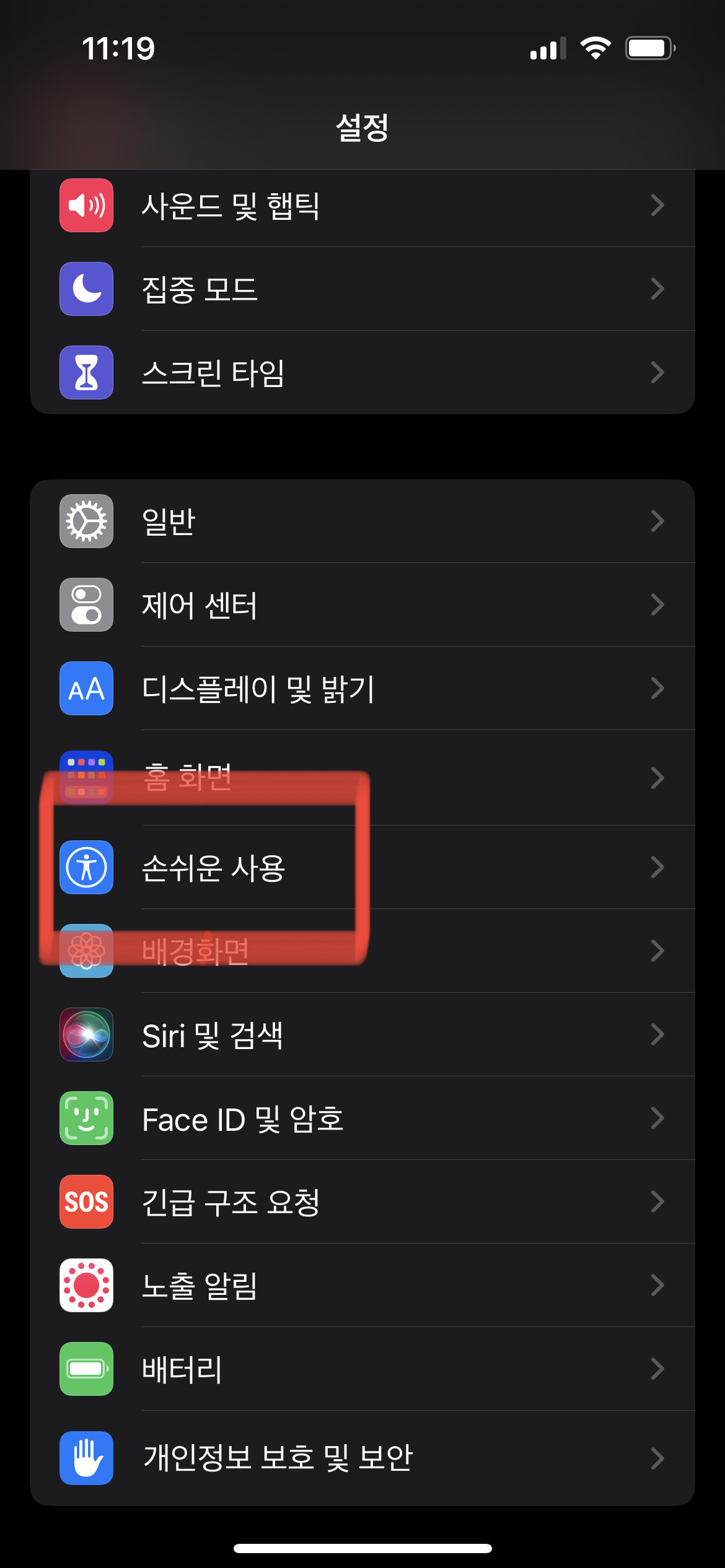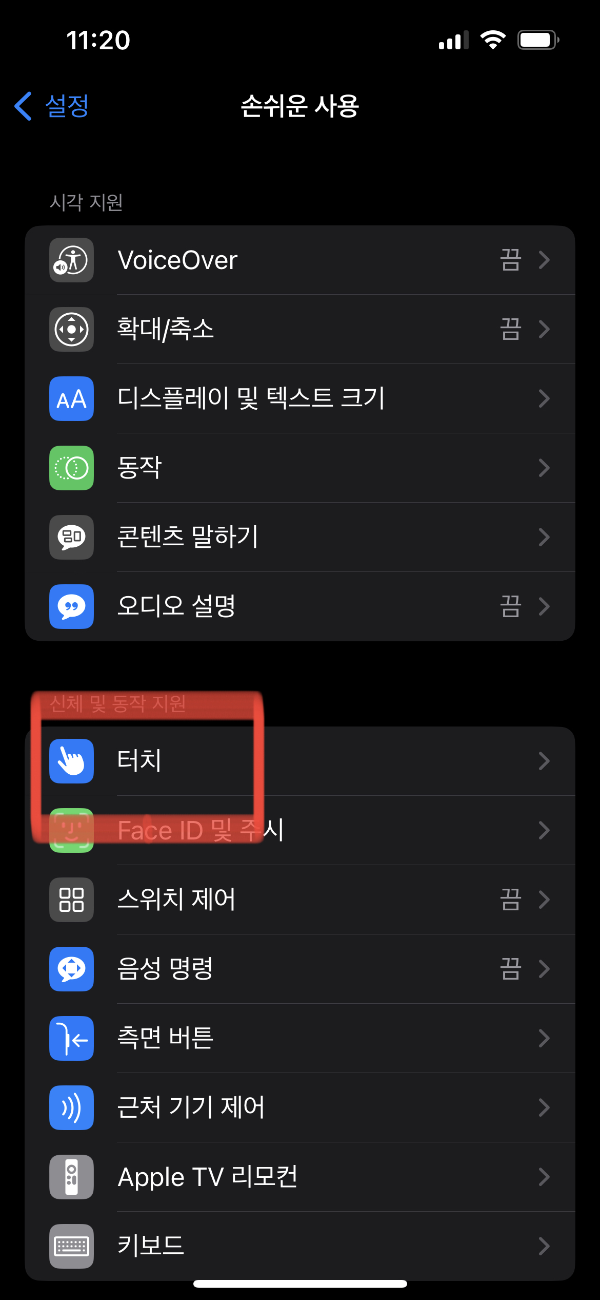 설정 앱으로 들어가서 '손쉬운 사용' - '터치' 매뉴로 들어갑니다.